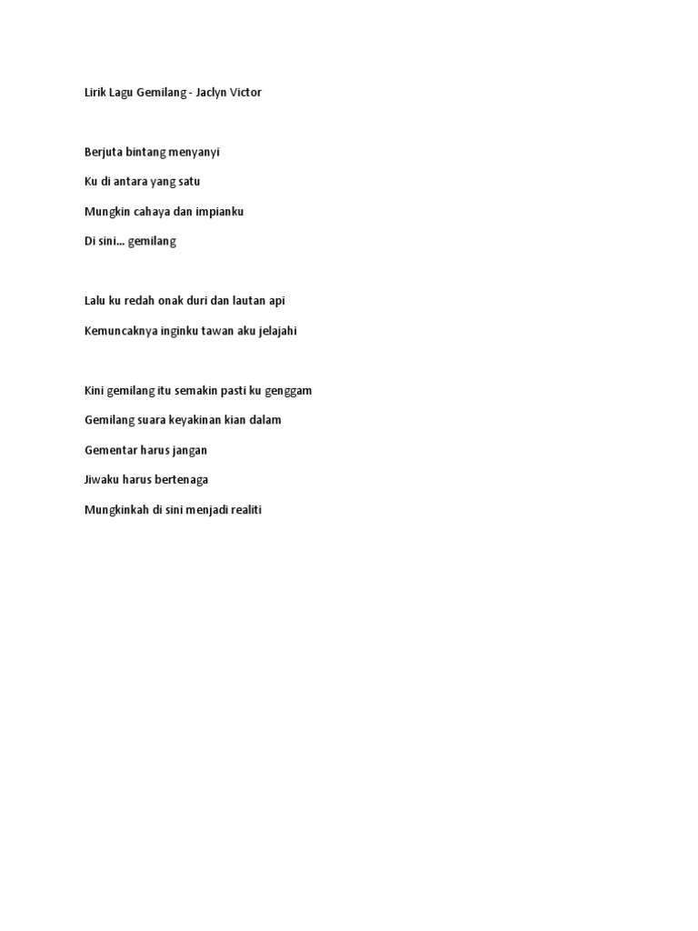 Kini gemilang itu semakin pasti ku genggam Gemilang suara keyakinan kian dalam Gementar harus jangan jiwaku harus bertenaga Mungkinkah ini menjadi realiti. Lirik Gemilang - Jaclyn Victor Berjuta bintang menyanyi Ku di antara yang satu Mungkin cahaya dan impianku Di sini gemilang Lalu ku redah o. Lagu Jaclyn Victor ini dikeluarkan secara digital dan semua platfrom streaming pada 29 Julai 2022.